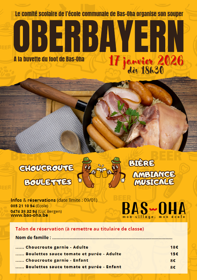 Le comité scolaire vous invite au souper Oberbayern à Bas-Oha, le 17 janvier 2026 !